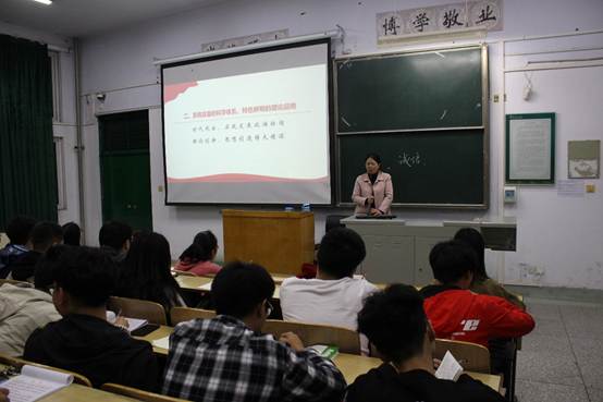 李宗亚老师主要从“立足时间之基,回答时代之问的科学理论”和“系统完备的科学体系,特色鲜明的理论品格”两方面展开讲解,她首先对习近平新时代中国特色社会主义思想做了系统介绍,并带领大家深刻领会“八个明确”和“十四个坚持”,希望大家立志成为优秀青年,推动中国建设,坚持“牢固树立四个意识,坚定四个自信”,认清面临的复杂形势和繁重任务,牢记初心使命,砥砺前进,勇担当、敢担当、善担当,在新时代新征程中始终干在实处、走在前列。
