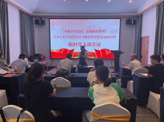 为了增强党员的党性意识,提升培训效果,充分发挥党员的先锋模范作用,经院党委研究决定,成立“重温百年党史,弘扬愚公精神”土木工程学院党史学习教育暨学院发展研讨班临时党支部,并召开支部会议。会上,范丽波书记强调了党员同志在外出培训过程中,要充分发挥党员的主观能动性,主动掌握参训学员的思想动态,激发学员们的学习热情,确保本次培训顺利完成。