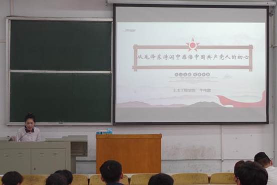 课上,牛伟娜老师以“从毛泽东诗词中感悟中国共产党人的初心”为主题,从“学不成名誓”到“粪土当年万户侯”;从“问苍茫大地,谁主沉浮”到“天翻地覆慨而慷”; 从“唤起工农千百万”到“六亿神州尽舜尧”;从“管却自家身与心”到“拒腐蚀、永不沾”四个方面进行了讲解。最后,牛老师以“看似寻常最奇崛,成如容易却艰辛。”告诉大家对于看似“寻常”的东西,不要轻视,不可忽视,有的“奇崛”就隐藏在看似平常的外表中,只有付出“艰辛”的劳动,才能做出貌似寻常而实为奇崛的事来。