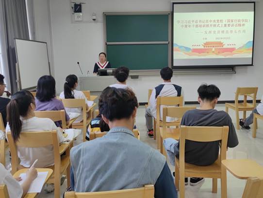 于洋老师以《学习习近平总书记在中央党校中青年干部培训班开班式上重要讲话精神》为题,结合自身政治理论的学习感悟,从“干部特别是年轻干部要提高七种能力”、“干字当头,不负大有可为的新时代”、“高校学生干部三种意识和三种能力”三部分进行了讲述。于老师指出,要想成为一名真正的共产党员,就要植根于民,造福于民,想群众之所想,急群众之所急,为广大人民群众办实事、办好事,而入党积极分子的学员们更要以此为标准要求自己,在学习生活中起到积极带头作用,坚持艰苦朴素、勤俭节约的优良作风。