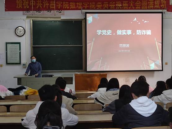 党课开始前,范丽波书记就疫情防控对同学们作出重要提醒,希望同学们注重个人防疫安全,保障个人健康。随后,范丽波书记通过“学党史、善思考”这一主题,讲解了常见的电信诈骗手段和案例。她强调,做好自身安全防护是学习党史、落实思想的重要基础,因此在日常的学习生活中我们应当时刻注重个人人身安全、财产安全。