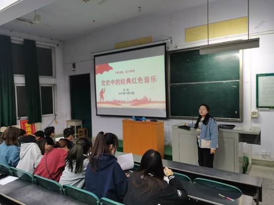 党课上,于洋老师选取了《义勇军进行曲》《东方红》《保卫黄河》等十首耳熟能详的时代红歌,并向大家展示了各个时代红歌的创作背景和歌曲分析,用红色经典音乐讲述党的百年发展历程,和同学们一起聆听峥嵘岁月里的时代旋律,让同学们深刻感受红色歌曲的精神内涵。