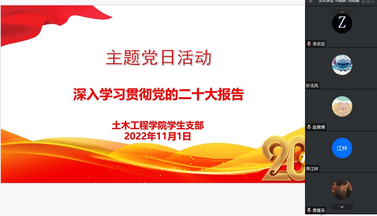 2022年11月1日下午,土木工程学院学生党支部在线上开展了“深入学习贯彻党的二十大报告”主题党日活动。本次活动由学生第一党支部书记任衍枭主持,学生第二党支部书记牛伟娜、学生第三党支部书记李宗亚和各支部学生党员及预备党员参加。