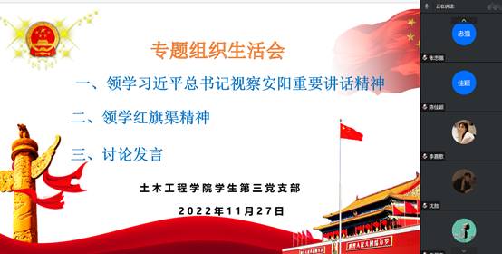 11月27日,学生第三党支部组织并召开了“学习总书记重要讲话,大力弘扬红旗渠精神”专题组织生活会。联点领导张忠强以及支部全体党员参加,支部书记李宗亚主持。
