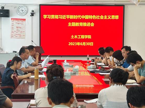 6月30日,土木工程学院召开学习贯彻习近平新时代中国特色社会主义思想主题教育推进会,会议由院长杜书廷主持,全体教师参加会议。