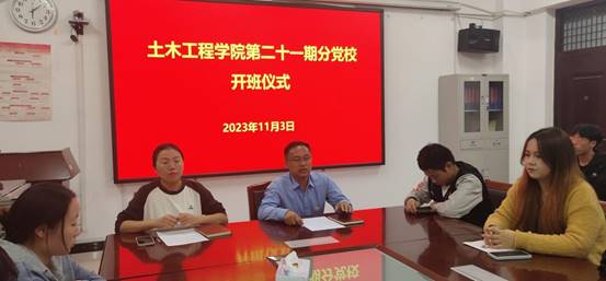 为深入学习贯彻习近平新时代中国特色社会主义思想和党的二十大精神,进一步端正积极分子的入党动机,切实做好入党积极分子的培养教育工作,土木工程学院分党校第二十一期入党积极分子培训班开班仪式于2023年11月3日在党员活动室举行,院党委书记姚向峰作动员讲话,第四十一期入党积极分子参加。组织员于洋主持开班仪式。