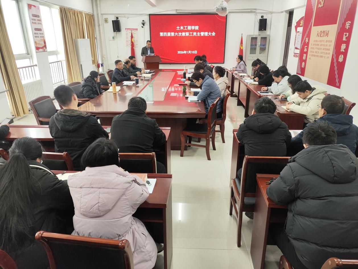 为进一步深化学院民主管理进程,凝聚全员奋进力量,助力学院在“十五五”开局之年实现高质量发展,1月10日上午,土木工程学院在503会议室召开第四届第六次民主管理大会。院领导姚向峰、杜书廷、张忠强、李丽慧、尚世宇出席会议,学院全体教职工齐聚一堂,共商学院发展大计。会议由党委副书记、分工会副主席张忠强主持。