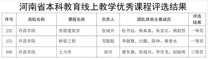 6月17日,河南省教育厅根据《关于组织开展河南省本科教育线上教学优秀课程评选活动的通知》(教高〔2020〕56号)精神,评选出一批本科教育疫情防控期间线上教学优秀课程。我院张成兴博士负责的《房屋建筑学》及苏聪聪老师负责的《桥梁工程》课程获得河南省本科教育线上教学优秀课程一等奖,徐可博士的《土力学》荣获三等奖。