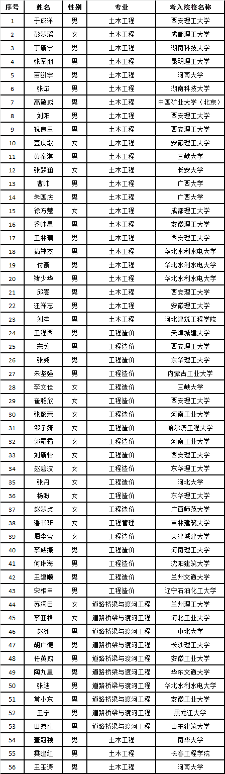 随着2020年全国硕士研究生录取工作接近尾声,我院考研捷报频传。今年,我院共有56名同学考取硕士研究生,考研录取率达到47%,有多名同学被哈尔滨工程大学、中国矿业大学、长安大学等国内重点高校录取。亮点纷呈,硕果累累!