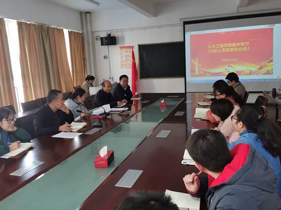 12月4日,我院在土木楼503会议室组织全体教职工专题学习了《中华人民共和国公职人员政务处分法》,会议由土木工程学院党委书记范丽波同志主持。