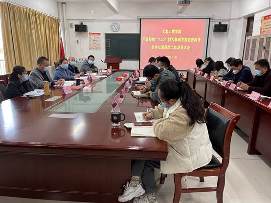 2022年4月1日,土木工程学院在503室,召开“能力作风建设年”系列活动之郑州“7.20”特大暴雨灾害追责问责案件以案促改动员会,全体教师参加会议。会议由院党委书记范丽波主持。