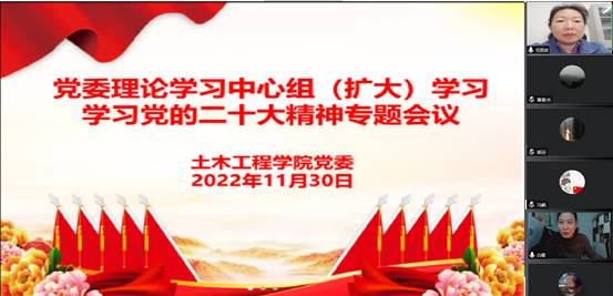 2022年11月30日,土木工程学院以线上形式召开党委理论学习中心组(扩大)学习会议,专题学习党的二十大精神,进一步部署学院党的二十大精神学习贯彻落实工作。学院党委委员、支部书记、全体科级干部参加,副院长李丽慧和尚世宇列席会议。
