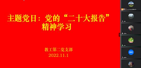 11月1日,为进一步深入学习党的二十大报告,深刻领会党的二十大精神,土木工程学院教工第二党支部线上开展了学习党的“二十大报告”精神主题党日活动,支部全体党员参加,支部书记唐东旗主持。