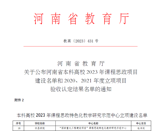 近日,河南省教育厅发布的《关于公布河南省2023年本科高校课程思政项目建设名单的通知》(教高〔2023〕431 号),我院杜书廷教授为中心主任的“国家重大工程建设项目”课程思政教学特色化教学研究示范中心获批“河南省本科高校课程思政教学研究特色化示范中心”。
