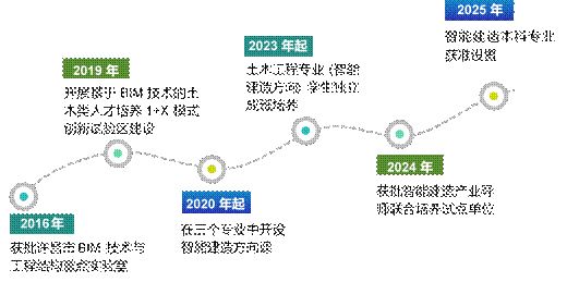 我院较早地开展了与智能建造相关的人才培养探索和实践。2016年,我院获批许昌市BIM技术与工程结构重点实验室,拥有BIM相关软件、VR投影仿真教学系统、混凝土3D打印机等设备,总价值超过650万元,主要承担土木工程应用软件、计算机辅助工程造价、施工组织设计、毕业设计等课程教学以及大学生BIM-CIM创新大赛、施工虚拟仿真大赛等学科竞赛训练,同时承担教师相关科研、教研活动。2019年,我院开展“基于BIM技术的土木类人才培养1+X模式创新试验区”建设。2020年起,我院在土木工程、工程造价、道路桥梁与渡河工程三个专业中开设智能建造方向课(如BIM5D技术与应用、3D打印技术与材料等)。2023年起,土木工程专业(智能建造方向)学生独立成班培养。2024年,我院获批智能建造产业导师联合培养试点单位。2024年9月,我院向教育部申请智能建造本科专业备案并成功获批。