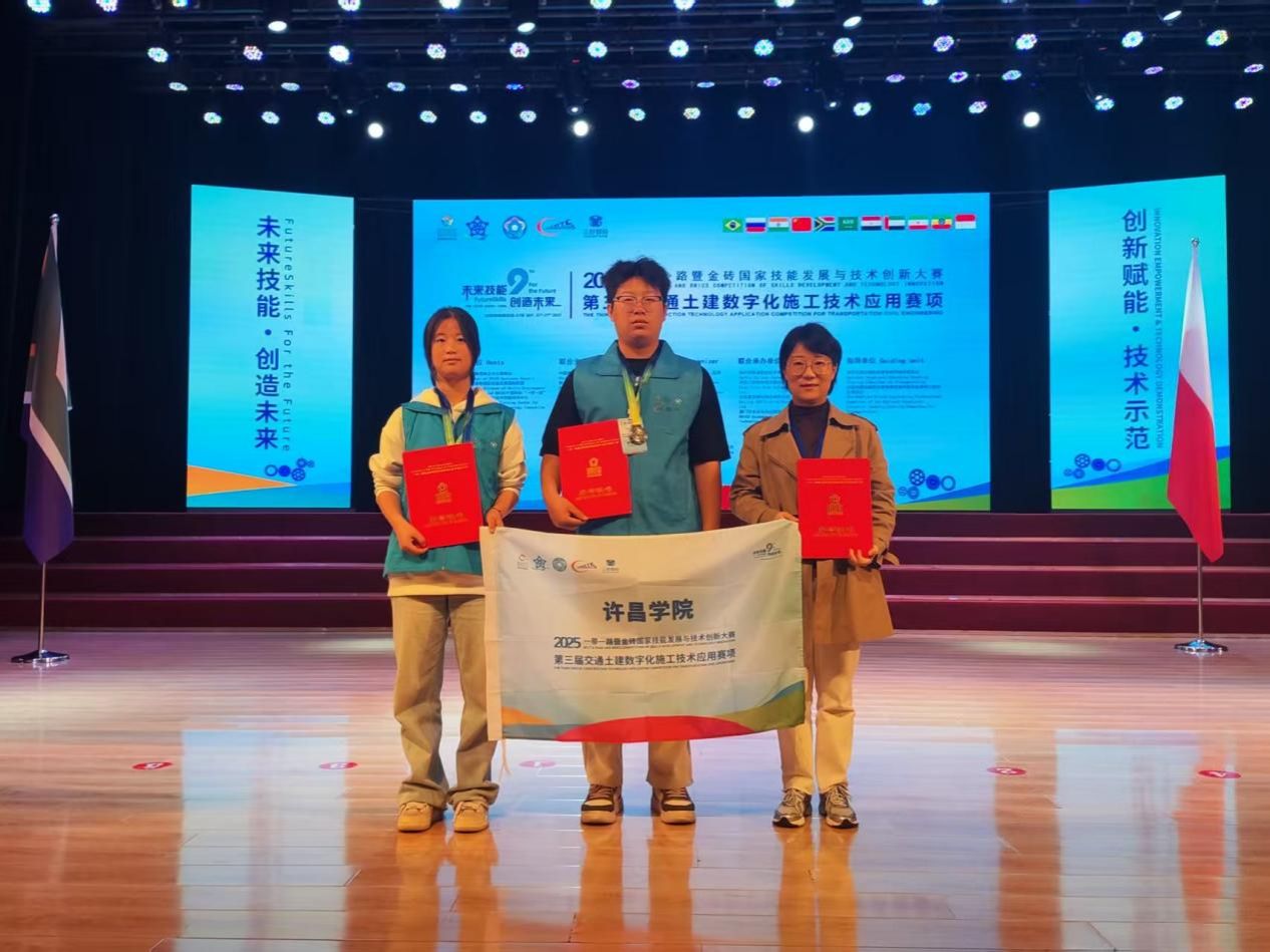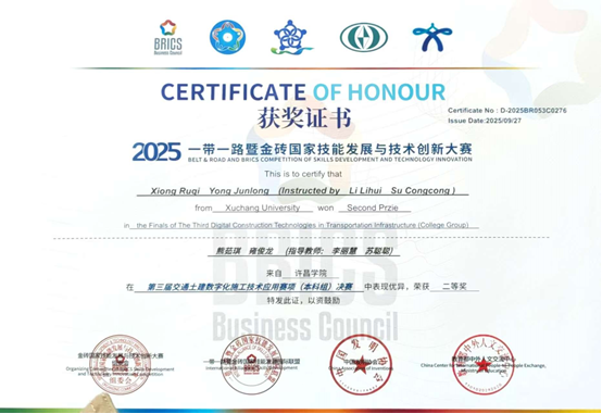 近日,2025“一带一路”暨金砖国家技能发展与技术创新大赛——第三届交通土建数字化施工技术应用赛项决赛在哈尔滨举行,我院学生熊茹琪、雍俊龙获得本科组团队二等奖。