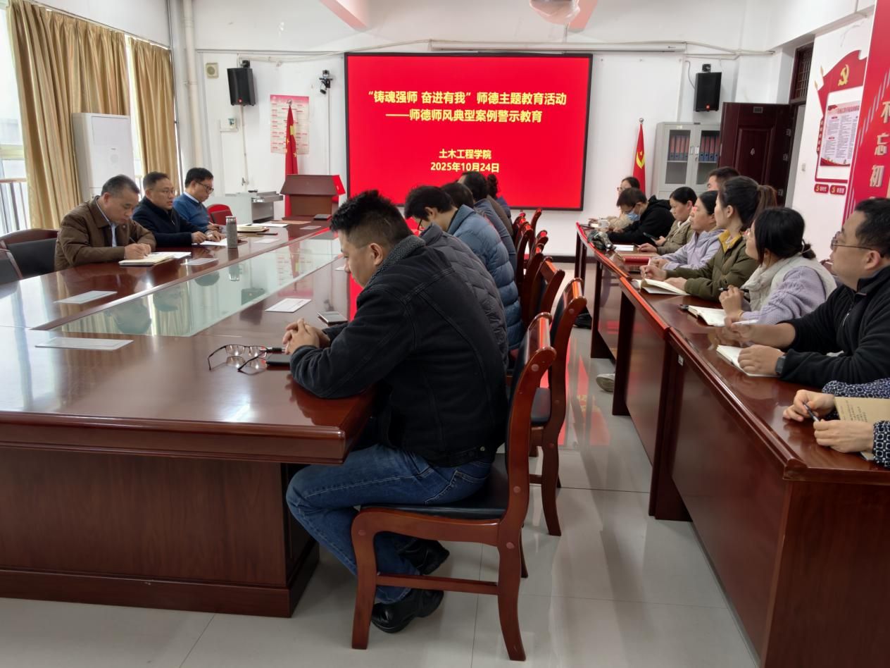 10月24日,土木工程学院召开“铸魂强师 奋进有我”师德主题教育——师德师风典型案例警示教育专题会议,旨在以反面典型为镜鉴,强化全体教师廉洁从教意识,筑牢立德树人思想根基。学院领导班子成员、全体科级干部、辅导员及党支部书记参会,会议由学院党委书记姚向峰主持。