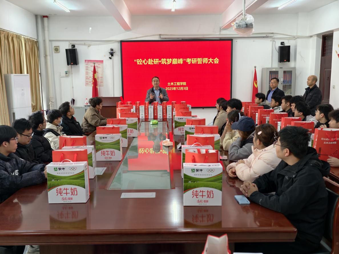 12月3日下午,土木工程学院在土木楼503室隆重举行“砼心赴研·筑梦巅峰”考研誓师大会。大会由院党委副书记张忠强主持,党委书记姚向峰、院长杜书廷、毕业班辅导员及考研学子共同参会,现场氛围庄重而热烈。