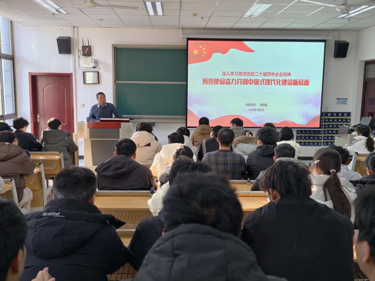 202618日,许昌学院党的二十届四中全会精神宣讲团成员、校党委学生工作部(处)长周银超走进土木工程学院和地理与空间信息学院,为入党积极分子和学生代表带来一场题为“深入学习贯彻党的二十届四中全会精神,勇担使命奋力开创中国式现代化建设新局面”的专题宣讲会。土木工程学院党委书记姚向峰主持。