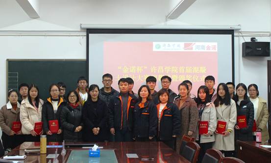 党总支副书记李琳宣布了获奖队伍名单并主持了颁奖仪式。由许昌金诺混凝土有限公司副经理李肖翰、党总支书记张利、副书记李琳分别向一、二、三等奖获奖者授予证书与奖金。颁奖环节后,获奖学生代表高亚宽发表获奖感言。至此,“金诺杯”许昌学院首届混凝土设计大赛圆满闭幕。