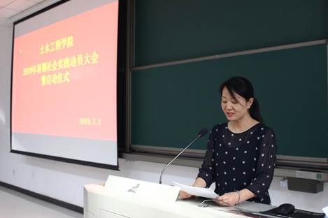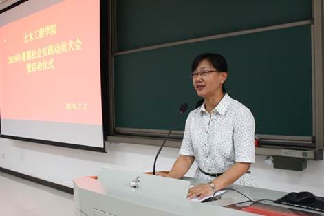 在雄壮的国歌声中,仪式正式拉开序幕。李琳书记宣读《土木工程学院2019年暑期社会实践活动方案》,并做安全工作部署。李书记简要介绍了我院暑期社会实践活动的筹备情况,对各团队实践活动的开展提出具体的要求,提醒参加社会实践的师生,务必提高安全意识,保证活动顺利开展。随后,指导教师代表唐东旗博士发言,他表示,在实践活动的开展中,将按照学校和学院的相关要求,结合专业特色,尽职尽责指导好学生顺利开展社会实践活动,他希望广大参加社会实践的同学能积极配合,不怕艰辛,在实践中服务社会,绽放青春。紧接着,学生代表盛典也做了表态发言,并带领全体同学宣誓。庄重严肃、热血澎湃的宣誓之后。张利书记作动员讲话,她首先对参与暑期实践的师生表示问候与祝福。她指出,学院长期以来高度重视社会实践工作,支持和鼓励我院学生通过实践去锻炼知识技能,提高专业素养。她希望所有实践队员能把握好这次机会,在实践中用心感受新中国的沧桑巨变和社会的巨大进步,自觉将个人命运与国家前途联系起来,坚定跟党走中国特色社会主义道路的理想信念;希望同学们发挥所长,结合专业优势,切实服务地方需求;希望参与社会实践的师生牢固树立安全第一的意识,确保实践活动安全有序。