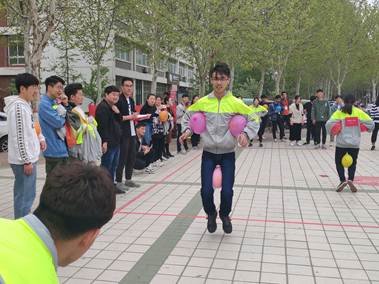 开幕式结束后,“凝心聚力”趣味体育比赛随即展开。比赛设置“过河搭桥”、“杯水传情”、“企鹅漫步”三个项目,我院派出三支代表队分别参赛。在“过河搭桥”项目中,六名队员使用五块脚板,协作交替前进,最终到达终点。“杯水传情”项目更是考验了队员之间的默契程度,第1名队员负责盛水,后5个人口衔纸杯传递水,倒入终点的水盆,最终以终点处水盆水量多少计算成绩,现场气氛紧张有趣。“企鹅漫步”项目中,要求参赛者需两腿、两手臂夹3个气球,呈企鹅状在跑道上行走,队员之间往返接力,最终按用时长短计算成绩。由于我院参赛队在三项比赛中的突出表现,最终取得全校第四名的优异成绩。