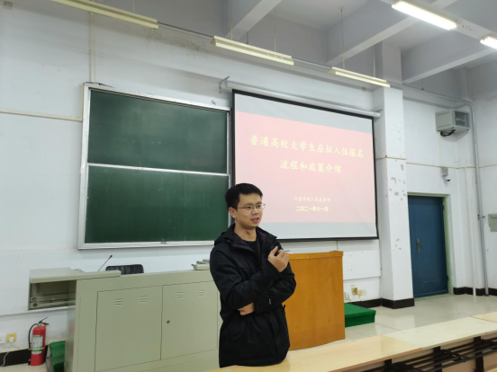 宣讲会上,罗老师为同学们解读了2022年大学生参军入伍的相关政策,结合我院优秀毕业生邱利杰服役经历与考研专项计划、资助政策的享用等事例,从入伍准备、注意事项、优待政策、成长收获等方面向各位新生进行了全方位征兵动员。同时,罗老师也在应征流程、体检要求等方面向21级新生做了全面系统的介绍。