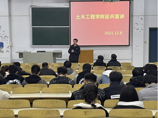 携笔从戎报国志,建功军营男儿郎。为贯彻落实习近平强军思想,扎实推进2022年征兵工作,12月8日晚,土木工程学院在A合六教室举行2022年春季大学生征兵政策宣讲会。征兵宣讲会由土木工程学院征兵专干罗春阳老师主讲,21级全体新生到场聆听。