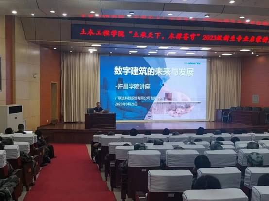 广联达数字建筑研究院高级业务专家赵阳光,以数字经济时代新特征为出发点,围绕建筑产业智能化、绿色化的发展思路,对建筑行业如何向智能建造方向转化落地进行了案例分享,引发了在场师生对行业未来的思考、对智慧城市的展望以及建筑行业未来前景的希冀。拉近了新生们与专业的距离,让他们感受到土木行业的魅力与无限潜力。