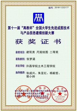 近日,第十一届“高教杯”全国大学生先进成图技术与产品信息建模创新大赛在南京工业大学落下帷幕。我院张成兴博士和朱亚红老师指导的2名学生参加了本次比赛,其中张梦涵同学在建筑类尺规绘图单项竞赛中获得二等奖的好成绩。全国大学生先进成图技术与产品信息建模创新大赛是高校院校图学类课程最高级别的国家级赛事,由于规模大、水平高、参赛人数多,被誉为“图学界的奥林匹克”,受到国内高校的普遍重视。本次大赛由教育部高等学校工程图学课程教学指导委员会、中国图学学会制图技术专业委员会和中国图学学会产品信息建模专业委员会主办,南京工业大学承办。大赛分机械类、建筑类、道桥类和水利类四个专业类别,其中建筑类竞赛包括尺规绘图、产品信息建模及工程图绘制和计算机建模及图纸输出等分项比赛。本届大赛有896人参加建筑类竞赛,我院第一次组织学生参加该项赛事并获奖。